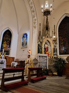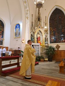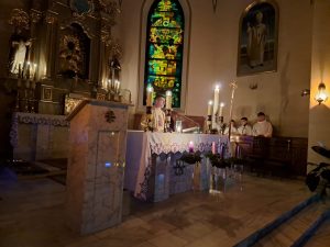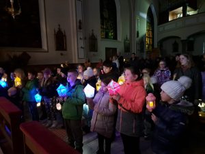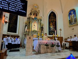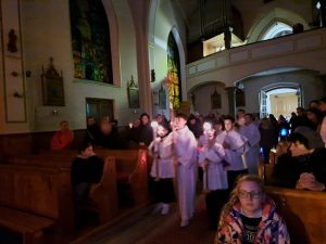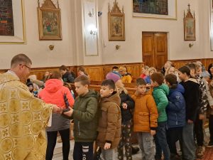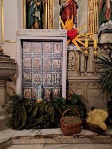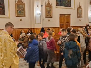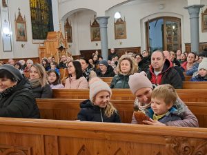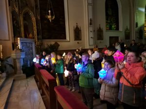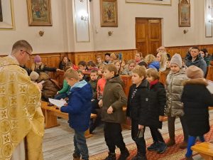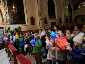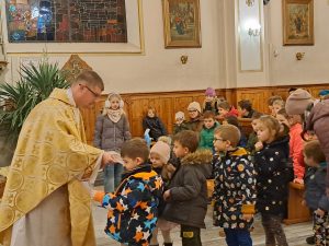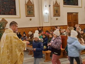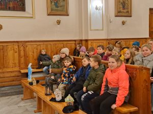 Dzisiaj ks. Ariel przybliżył nam symbolikę adwentowej dekoracji… Obok chrzcielnicy szczególne DRZWI, nazwane DRZWIAMI ŚWIĘTYMI… Gdybyśmy dzisiaj zechcieli przez nie przejść nie udało by się… Są jeszcze zamurowane wewnątrz i tak jak nasza replika nie mają klamki z zewnątrz… Gdzie takie drzwi są? Teraz nie zdradzamy, bo to przecież pytanie na jutro, aby móc wylosować jedną z figurek… Figurki Maryi i Józefa, które chcą powędrować do naszych domów na rodzinną modlitwę. Dzisiaj powędrowały do NAJMŁODSZYCH…