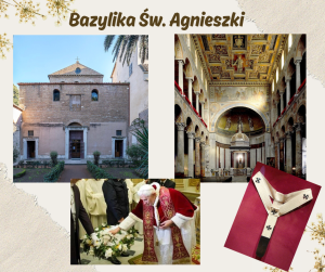 Święta ma w Rzymie dwa kościoły. Jeden to bazylika św. Agnieszki z pięknym wizerunkiem świętej w chwale nieba, a za murami miasta jest kościół św. Agnieszki, przy którym siostry zakonne hodują owieczki. Imię Agnieszka po łacinie znaczy „owieczka”. Męczeństwo Agnieszki odbyło się właśnie 21 stycznia i w ten dzień przyprowadza się do papieża te dwie owieczki – białą i czarną. Papież błogosławi te 2 owieczki, które później strzyże się z wełny, wyrabia nici i wykonuje się niezwykłą szatę liturgiczną. Tą szatę liturgiczną przygotowują właśnie siostry zakonne i nazwana jest paliuszem. To pas materiału utkany z białej wełny i na nim są wyhaftowane jest 6 czarnych krzyżyków (Taką szatę nosi papież i arcybiskupi największych miast). Paliusze są przechowywane w bazylice św. Piotra nad jego grobem i papież 29 czerwca uroczyście wręcza je nowo mianowanym arcybiskupom w całym roku. Biskupi nominaci zjeżdżają 29 czerwca – w święto apostołów Piotra i Pawła do Rzymu, razem z papieżem odprawiają mszę świętą, wręcza im paliusz jako znak jedności między papieżem i wszystkimi biskupami świata. Paliusz założony na ramiona oznacza dobrego pasterza, który nosi swoich wiernych, tak jak Jezus Dobry Pasterz.