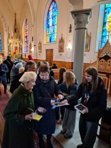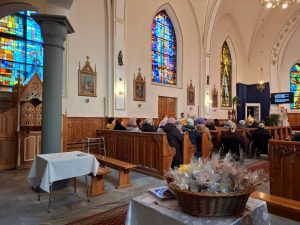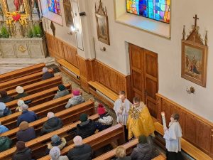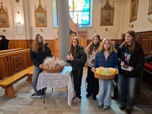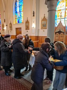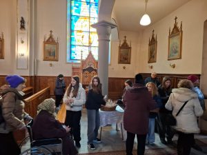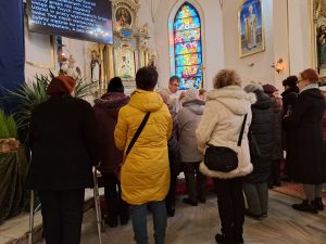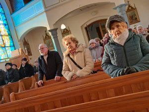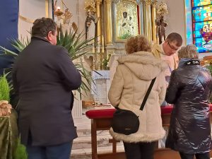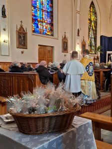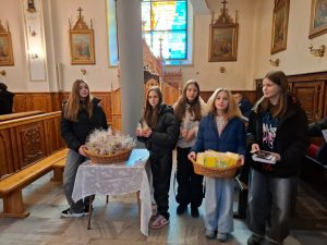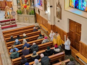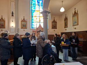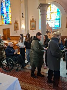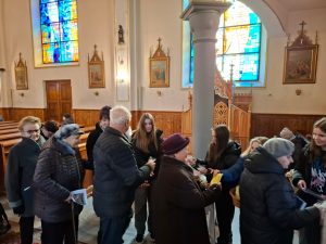 Na koniec wierni otrzymali błogosławieństwo na sposób lourdzki. Zaś przy wyjściu z niespodzianką czekały dzieci ze Szkolnego Koła Wolontariatu przy Szkole Podstawowej nr 1 im M. Kopernika w Porąbce… Obdarowali zebranych laurkami wykonanymi przy udziale dzieci ze świetlicy szkolnej, upieczonymi własnoręcznie muffinkami oraz modlitwą seniora. Dziękujemy dzieciom za przygotowane upominki – to już taka mała tradycja Szkolnego Koła Wolontariatu.