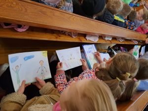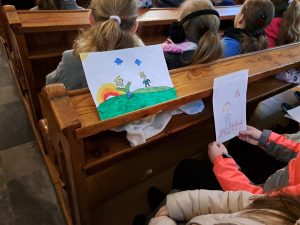 W najmłodszej grupie szczególnie odkrywały dzieci MIŁOŚĆ… Kogo można kochać? Burza mózgów, było tego wiele… puentą Kocham BOGA, DRUGIEGO CZŁOWIEKA i SIEBIE… I to właśnie mieli przynieść w formie rysunków na zakończenie rekolekcji… A także piosenka wpadająca łatwo w ucho.