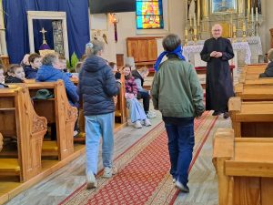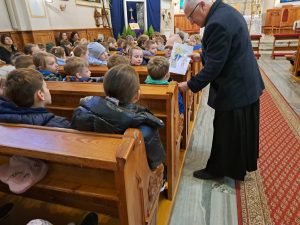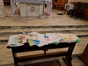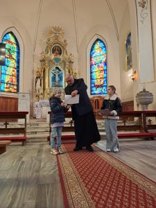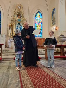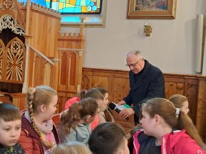 dzieci podarowały słoiczek wypełniony ziarnami pszenicy – to symbol zasiewu nauk rekolekcyjnych wygłoszonych do uczniów… Gdy ksiądz Tadeusz je wysieje po powrocie, to będzie zielona podkładka świąteczna pod dar starszej grupy – przygotowany do wielkanocnego poświecenia baranek z ciasta, oczywiście z chorągiewką Zmartwychwstałego, babeczka i pisanka – to jako kawałek Polski. Najstarsza grupa zaś wręczyła cebulki i nasiona kwiatków – takie do posadzenia… Trudno byłoby w samolocie wędrować z bukietem kwiatów, a tak to będą kwitły sukcesywnie po posianiu i posadzeniu na włoskiej ziemi…