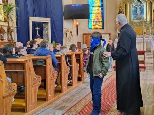 Dajmy się prowadzić Panu Bogu przez życie – fajna ilustracja nas prowadziła – mam zawiązane oczy i głos prowadzi mnie do celu. W tym głosie odkryliśmy nasze SUMIENIE, głos mówiący co wybierać, jaką drogą pójść, to GŁOS BOGA.
