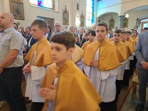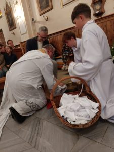 Ewangelia wprowadziła nas w OBRZĘD OBMYCIA NÓG – (łac. mandatum – przykazanie), a w komentarzu usłyszeliśmy: Jezus Chrystus, będąc Mistrzem, stał się sługą wszystkich. Znakiem Jego wielkiej miłości i gotowości do służby, aż do oddania życia za przyjaciół stało się umycie nóg Apostołom w Wieczerniku. Za każdym razem, gdy poświęcamy się dla drugich, okazujemy się prawdziwymi uczniami Tego, z którym jednoczymy się w Eucharystii. Na pamiątkę umycia nóg Apostołom przez Jezusa, Celebrans, ( w tym roku był to ks. proboszcz Zdzisław Grochal) umyje nogi dwunastu mężczyznom. Wśród nich znajdują się kandydat do sakramentu bierzmowania oraz chłopiec, który w tym roku po raz pierwszy przyjmie Komunię Świętą.