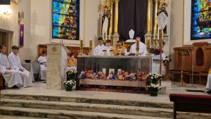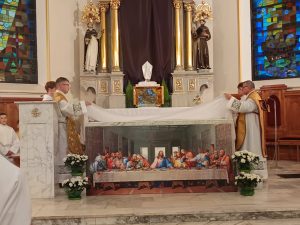 Ostatnim aktem dzisiejszej Liturgii było OBNAŻENIE OŁTARZA. Nagi ołtarz jest znakiem obnażonego i upokorzonego w czasie męki Zbawiciela. Jest to również znak, który uświadamia nam, że w dniach męki i śmierci Jezusa nie sprawuje się Mszy Świętej.