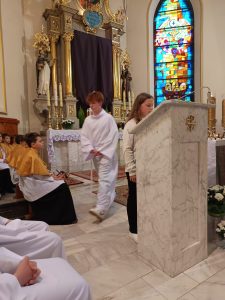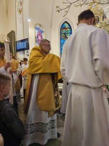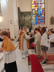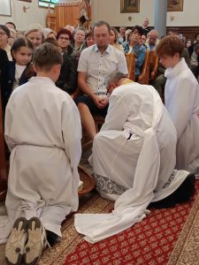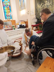 Ewangelia wprowadziła nas w OBRZĘD OBMYCIA NÓG – (łac. mandatum – przykazanie), a w komentarzu usłyszeliśmy: Jezus Chrystus, będąc Mistrzem, stał się sługą wszystkich. Znakiem Jego wielkiej miłości i gotowości do służby, aż do oddania życia za przyjaciół stało się umycie nóg Apostołom w Wieczerniku. Za każdym razem, gdy poświęcamy się dla drugich, okazujemy się prawdziwymi uczniami Tego, z którym jednoczymy się w Eucharystii. Na pamiątkę umycia nóg Apostołom przez Jezusa, Celebrans, ( w tym roku był to ks. proboszcz Zdzisław Grochal) umyje nogi dwunastu mężczyznom. Wśród nich znajdują się kandydat do sakramentu bierzmowania oraz chłopiec, który w tym roku po raz pierwszy przyjmie Komunię Świętą.