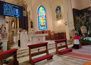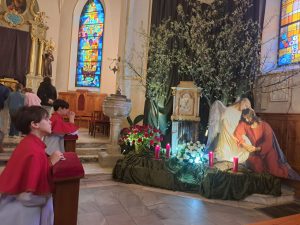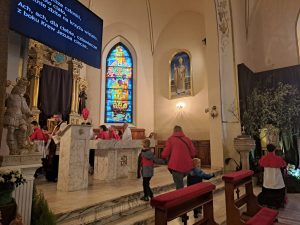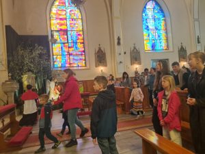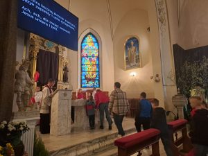 2 Po Drodze krzyżowej za ks. Arielem i ministrantami podchodzimy do pustego prezbiterium. Oddajemy cześć OŁTARZOWI całując go. W ten jeden wyjątkowy dzień w roku nie sprawuje się na nim mszy świętej, bo dzisiaj obchodzimy pamiątkę TEJ JEDNEJ OFIARY KRZYŻA – śmierci Pana Jezusa.