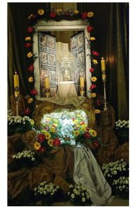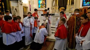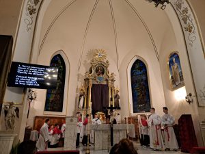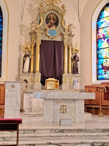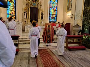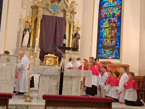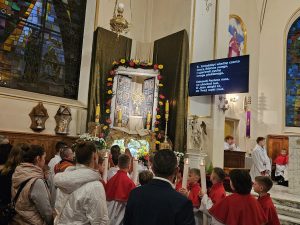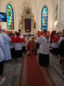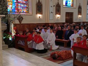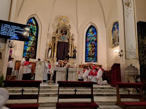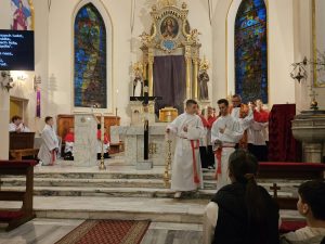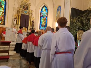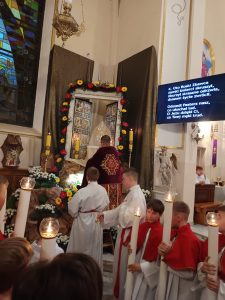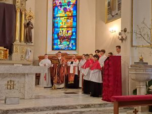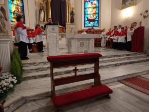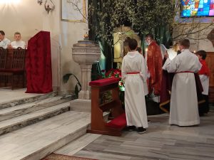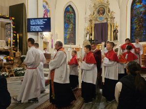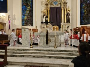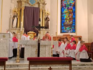 Zgodnie z wielowiekową tradycją ostatnim aktem liturgicznym było dziś przeniesienie NAJŚWIĘTSZEGO SAKRAMENTU DO GROBU PAŃSKIEGO.  Rozpoczął się  czas ADORACJI CAŁONOCNEJ i JUTRZEJSZEGO DNIA, aż do rozpoczęcia Wigilii Paschalnej. Monstrancja została zakryta welonem, co symbolizuje owinięcie ciała Jezusa w białe płótno i postawiona w naszych „Drzwiach Jubileuszowych”, które towarzyszą nam od Adwentu i przypominają zdrój łask Miłosierdzia Bożego dla każdego z nas.