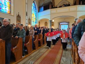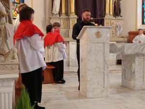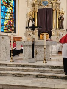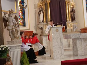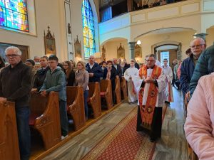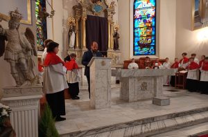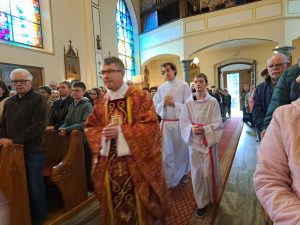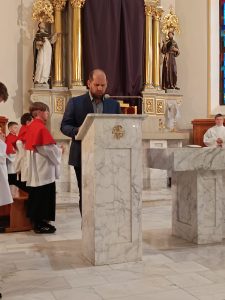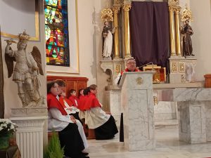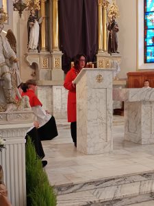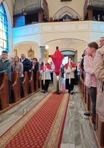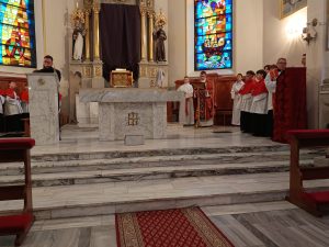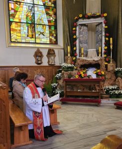 Po przejściu do prezbiterium rozpoczęła się LITURGIA SŁOWA, w której naczelne miejsce zajmował OPIS MĘKI PAŃSKIEJ według św. Jana odśpiewany przez p. Michała organistę i naszych Kapłanów.  Słowo homilii ks. Zdzisława, przepełnione modlitwą i zaproszeniem do refleksji: Jezu pozwoliłeś na to by ludzie odwrócili się od Ciebie, zgodziłeś się zostać odrzucony, abym ja mógł zostać przyjęty do Twego niebieskiego Królestwa… Dziękuję Ci Jezu , bo uczyniłeś to dla mnie. A dalej  pytanie pobudzające do myślenia: kim jestem z Męki Pana Jezusa? kapłanem, faryzeuszem, Piłatem, żołnierzem, jednym z tłumu, współczująca Weroniką, przymuszonym Szymonem, którym z współwiszących łotrów, kobietami… Z pewnością jest to pytanie do refleksji nadchodzącego dnia CISZY GROBU.