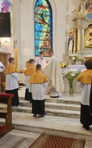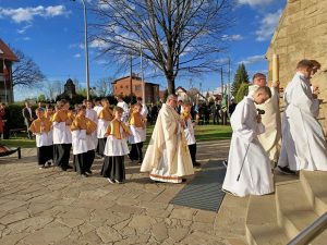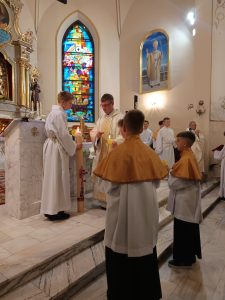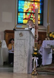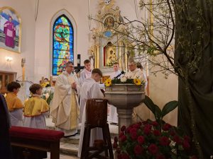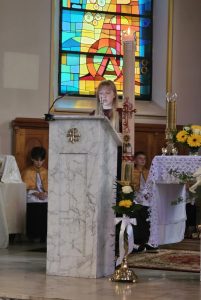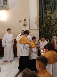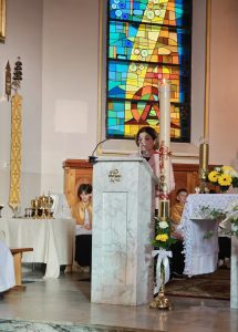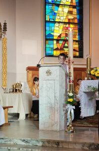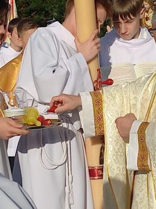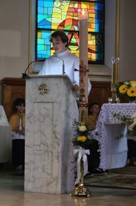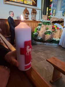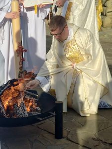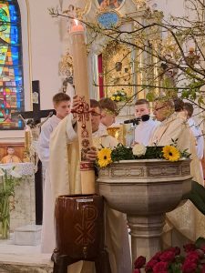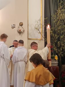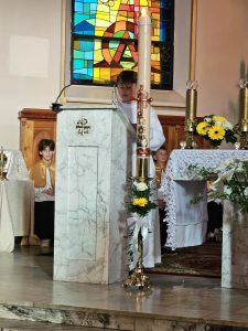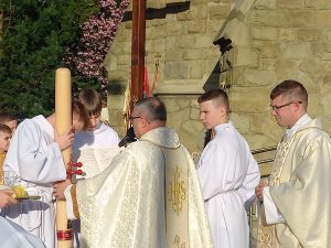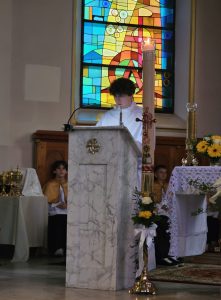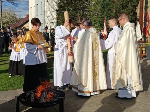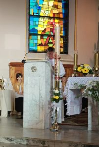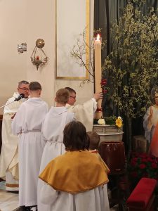 Celebrans dzisiejszego dnia ks. proboszcz Zdzisław wraz z asystą liturgiczną procesyjnie przyszli do przygotowanego ognia.  OGIEŃ POŚWIĘCONO, przygotowano PASCHAŁ – znak Jezusa Zmartwychwstałego, zapalono go od poświęconego ognia i w uroczystej procesji ks. Ariel wniósł  do kościoła. Słyszeliśmy trzykrotne zawołanie – ŚWIATŁO CHRYSTUSA, a w naszych dłoniach zapłonęły świece. Kościół rozświetlił się blaskiem migocących płomyków. Wybrzmiał uroczysty EXULTET – ORĘDZIE WIELKANOCNE. Ten hymn uwielbienia jest śpiewany raz w roku, właśnie tej Nocy Zmartwychwstania Pana.