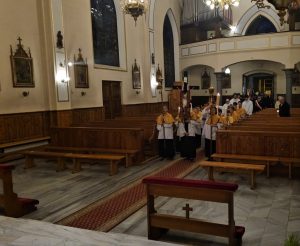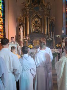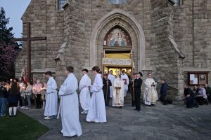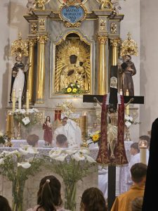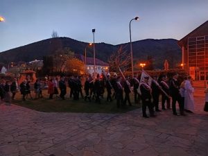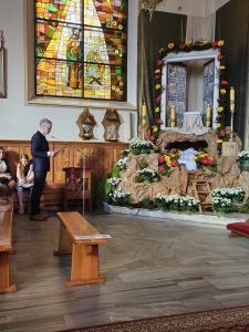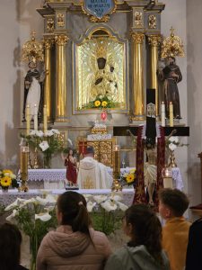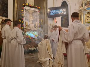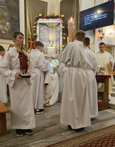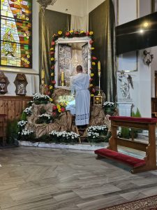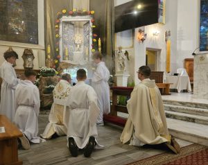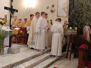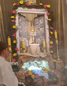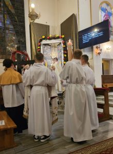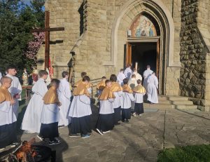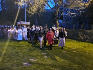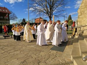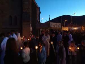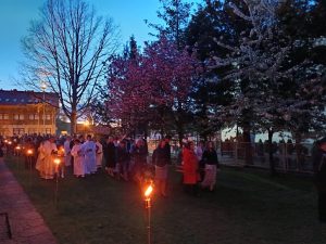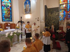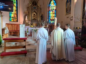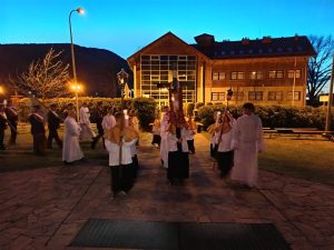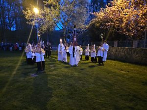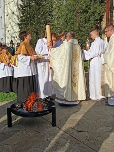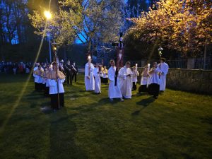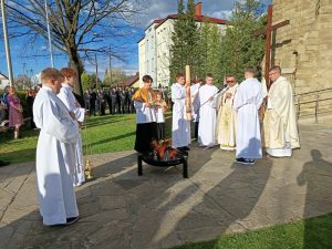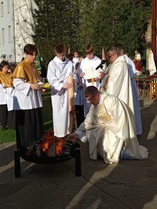 W kościele kończono czuwanie przy Bożym Grobie NOWENNĄ 2 dnia przed świętem Bożego Miłosierdzia. Przed kościołem przygotowano ogień i gromadzili się wierni. Chociaż nie zapanował jeszcze mrok, to uświadamiamy sobie, że brak światła jest symbolem grzechu i śmierci.