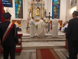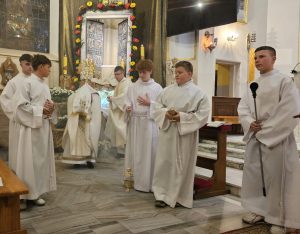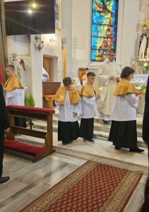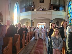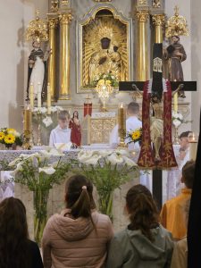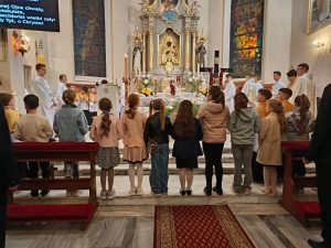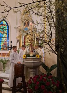 Zaniesiono wodę do kropielniczek w przedsionku kościoła,. Odnowiliśmy PRZYRZECZENIA CHRZCIELNE i zostaliśmy pokropieni wodą – to dotknięcie  pamiątki naszego chrztu.