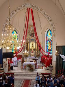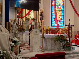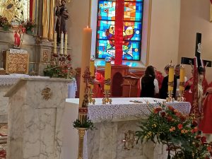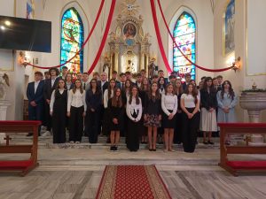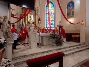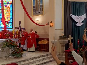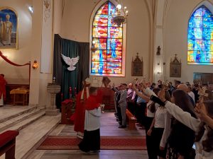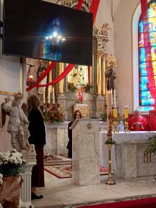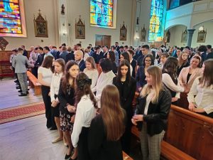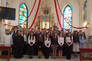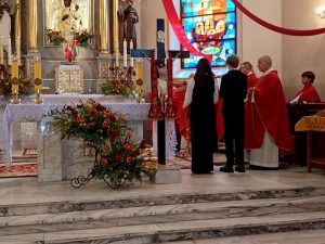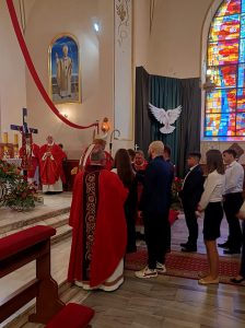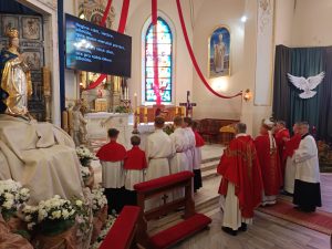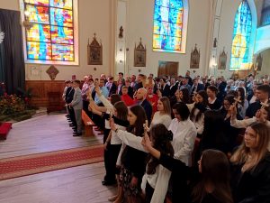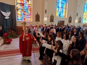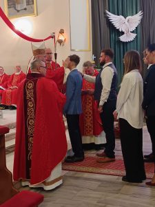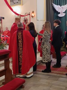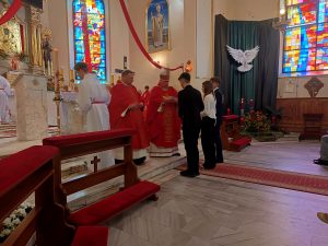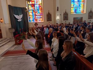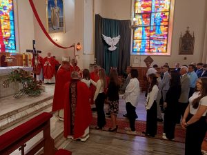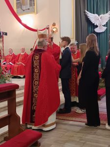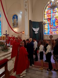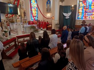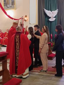 Młodzież, świadkowie i rodziny zgromadzili się w świątyni, aby trwać na modlitwie, jak apostołowie w wieczerniku razem z Maryją. Modlili się dziesiątką Różańca – tajemnicą Zesłaniu Ducha Świętego, litanią loretańską i śpiewem.