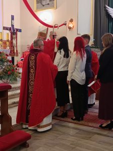 Modlitwa wiernych, liturgia eucharystyczna z komunią świętą, podziękowanie młodzieży za dar sakramentu z prośbą o błogosławieństwo oraz poświęcenie krzyży, które mają przypominać o dzisiejszym dniu oraz wspólne zdjęcie.