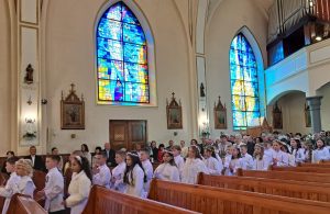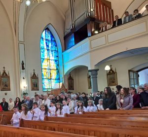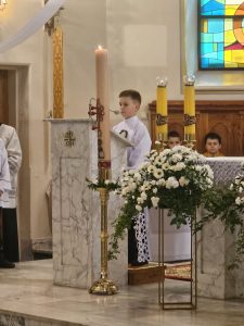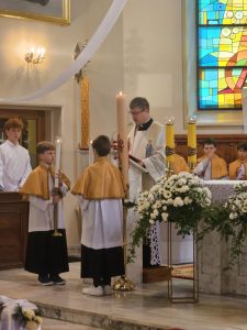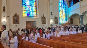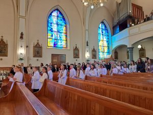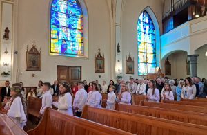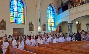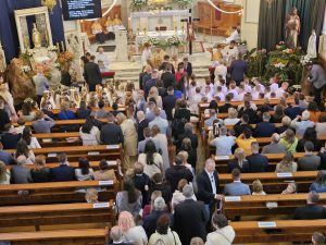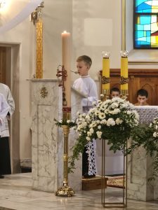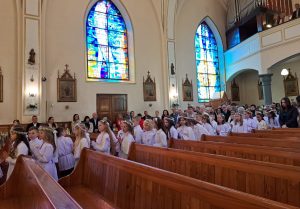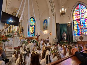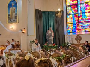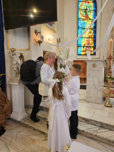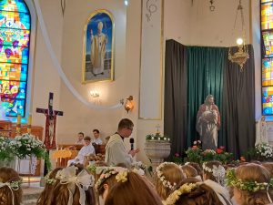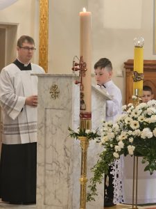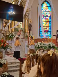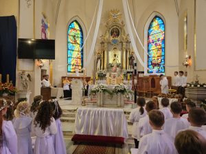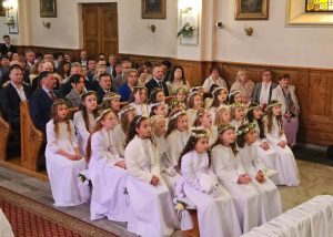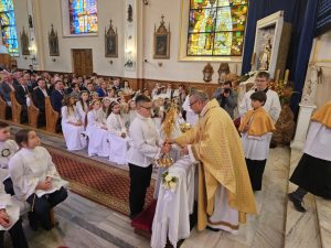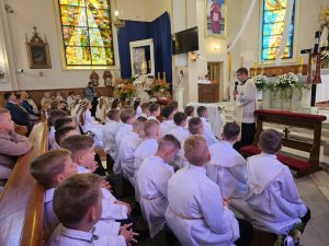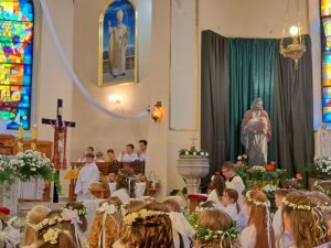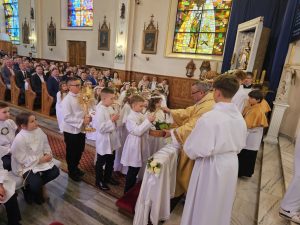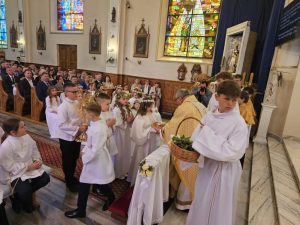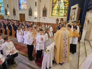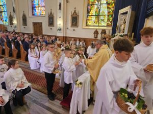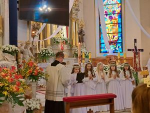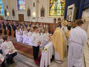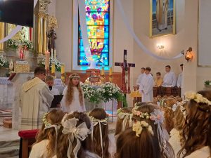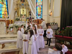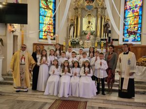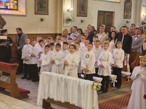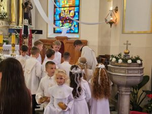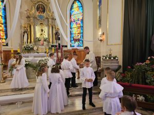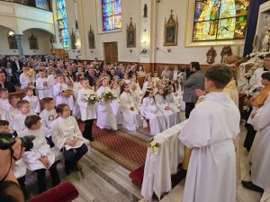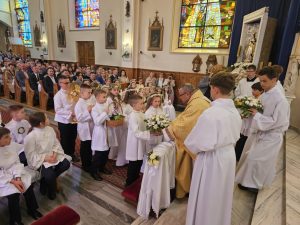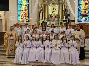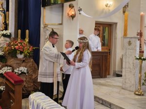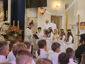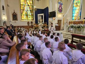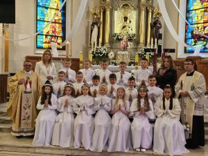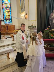 Dzisiaj my wszyscy przeprowadzamy was z wielką radością tutaj do tego kościoła abyście zaczęli jedną z najwspanialszych przygód życia jaką jest podążanie za JEZUSEM który jest JEDYNYM, DOBRYM PASTERZEM.  My wszyscy, którzy Mu pomagamy – rodzice, dziadkowie, nauczyciele, katecheci, księża nie zawsze we wszystkim jesteśmy dobrymi pasterzami, ale całą naszą rolą jest właśnie doprowadzenie was do Niego tu – Jezusa Chrystusa, na którym zawsze możecie polegać dzisiaj zjednoczcie się z Nim całkowicie przyjmując go w Komunie świętej.