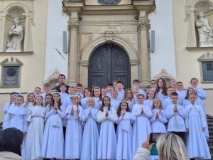 Jesteśmy tu dzisiaj po to, byście dziękując za swoją Pierwszą Komunię szczególnie powierzyli się Maryi. Byście nie tylko do niej się modlili, ale byście ją zawsze traktowali jako swoją DRUGĄ MAMĘ. Mamę, która jest w niebie i która z nieba wami się opiekuje. Niech te słowa OTO MATKA TWOJA gdzieś brzmią wam zawsze przez całe życie w uszach i niech to miejsce właśnie będzie tym miejscem, do którego będziecie lubili wracać, aby sobie przypomnieć że macie Maryję Matkę w niebie, która troszczy się o was i wami się opiekuje.