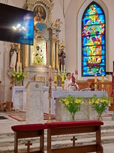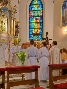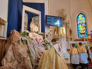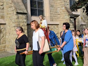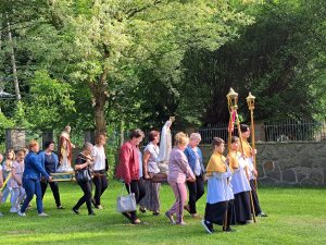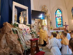 Msza święta w wigilię Wniebowstąpienia z błogosławieństwem i procesyjnym wyniesieniem figurki Zmartwychwstałego Jezusa.