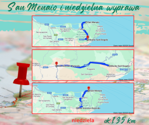 Dzisiaj drogą pełną serpentyn jechaliśmy przez FORESTA UMBRA (malownicza część Parku Narodowego Gargano) ewenement we Włoszech – piękny bukowy las. Czuliśmy się jak na drodze do Wielkiej Puszczy albo na Trzonce. Tą drogą dotarliśmy do Monte Sant Angelo na spotkanie z Michałem Archaniołem”.