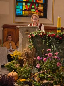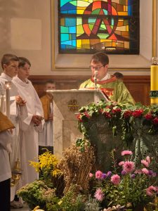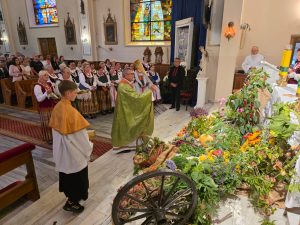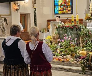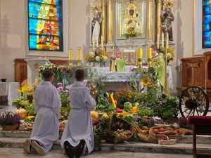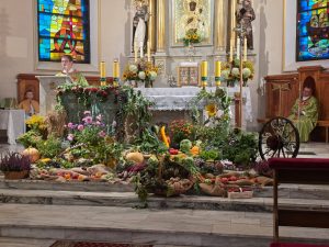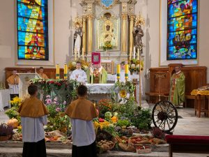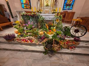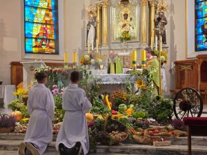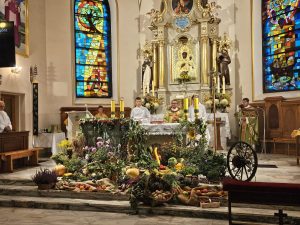 Od najdawniejszych czasów CHLEB był w tradycji polskiej symbolem dostatku i o ten chleb powszedni się troszczono. Koniec sierpnia to czas dożynek – podziękowania Bogu i ludziom za dar chleba. Jako, że w naszej wiosce niewiele już uprawiających rolę, ale wciąż mamy przydomowe ogródki warzyw i kwiatów od dwóch lat ostatnia niedziela sierpnia to nasze parafialno – wioskowe DZIĘKCZYNIENIE.