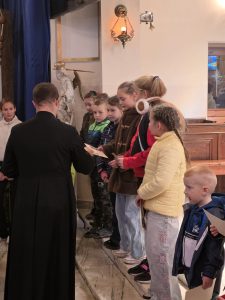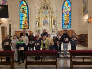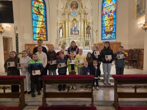 Chyba jeszcze tak nie było, żeby w ręku konkursowiczów nie znalazły się nagrody? W niedzielę po mszy świętej o godz. 11.00 dzieci promujące i zapraszające swoim plakatem na różaniec otrzymały tylko dyplomy… Po prostu kurier nie dotarł 🙂