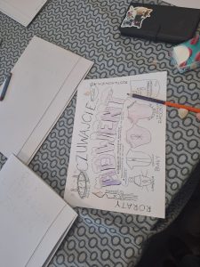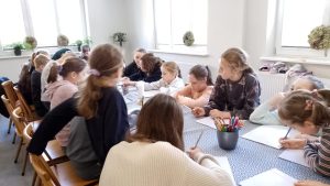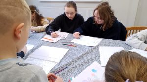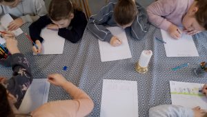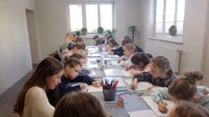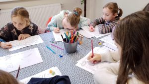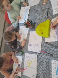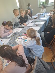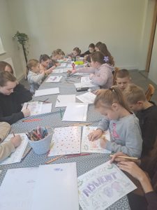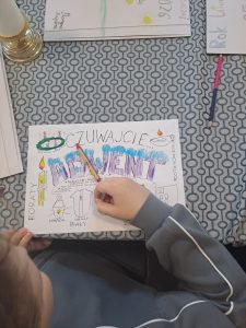 Więc była i chwila modlitwy dziękczynnej za mijający rok i prośby o dar błogosławionego roku… Z tej okazji przygotowywaliśmy teczki na nowy rok, na których dzieci rysowały swoje znaki rozpoznawcze, a gromadzić w nich będą swe notatki i aktywności. Po zakończeniu pracy twórczej przyszedł czas na spokojniejsze zajęcia, a mianowicie wykonanie „adwentowej ściągi” kolorowanie adwentowych ilustracji, wprowadzając nas wszystkich w atmosferę zbliżającego się Adwentu.