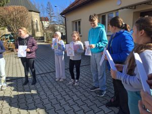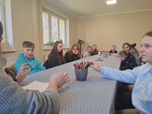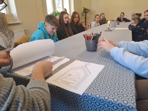 Po przygotowaniu prac przyszedł czas na dzielenie się. Każde dziecko mogło pokazać swoją stację i powiedzieć, jak ją rozumie oraz co najbardziej zwróciło jego uwagę. Było to bardzo twórcze spotkanie. Na koniec był czas na wspólną zabawę i integrację.
