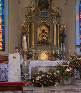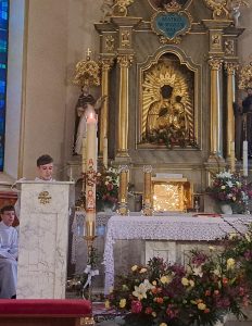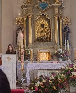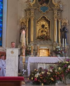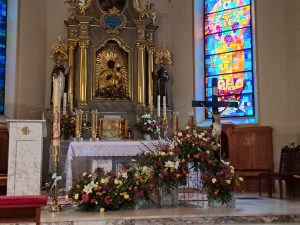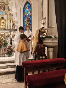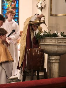 Do naszej chrzcielnicy kapłan wlał wodę, u jej stóp umieszczono wodę w naczyniu do przedsionka kościoła, gdzie zawsze możemy zaczerpnąć wody święconej… Modliliśmy się Litanią do Wszystkich Świętych… Kapłan w modlitwie przywołał wielkie dzieła Boga: wody stworzenia, potop oczyszczający świat, przejście Izraela przez Morze Czerwone, a nade wszystko chrzest Jezusa w Jordanie. Każde z tych wydarzeń splata się w jedno, ukazując wodę jako znak życia, oczyszczenia i nowego początku. Paschał został zanurzony w wodzie — światło spotyka się z głębią. To symbol Chrystusa, który przez śmierć wszedł w otchłań, aby ją przemienić i napełnić życiem. Woda zostaje pobłogosławiona, staje się święta, gotowa przyjąć tych, którzy pragną narodzić się na nowo. Więc nasze ODNOWIENIE PRZYRZECZEŃ CHRZCIELNYCH i zostaliśmy obficie okropieni nową wodą święconą.