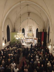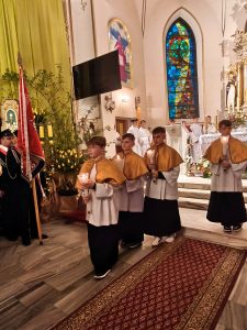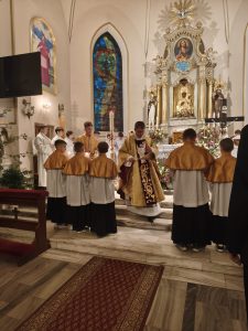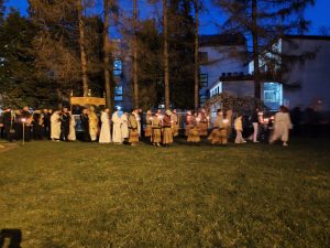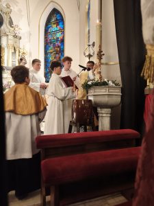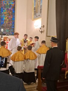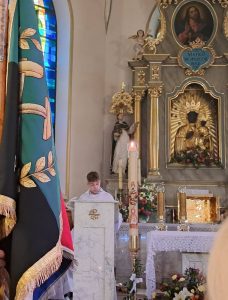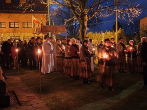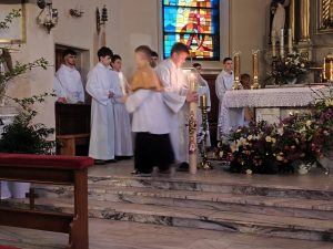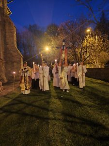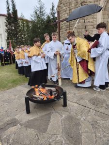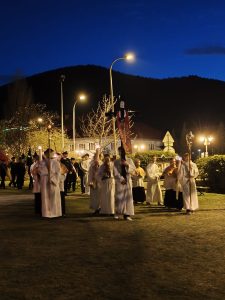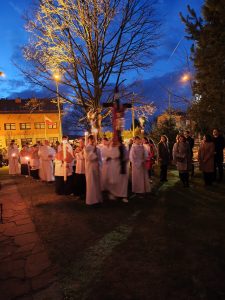 Kościół pogrążył się w mroku, jak świat bez nadziei. Na zewnątrz zapalono OGIEŃ— żywy, prawdziwy, symbol NOWEGO ŻYCIA. Od niego zapalono PASCHAŁ – świecę oznaczającą Chrystusa: „Światłość świata”. Światło uroczyście wniesiono do kościoła, a następnie przez ministrantów rozchodziło się z rąk do rąk. Jedna świeca zapalała drugą — i nagle ciemność ustępowała wspólnocie światła. To znak, że nadzieja nie jest samotna, lecz przekazywana dalej.