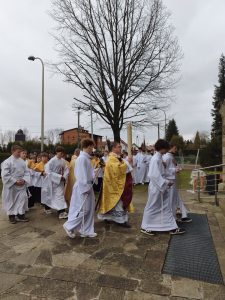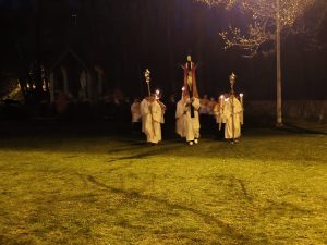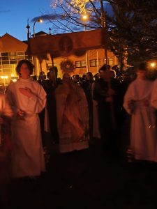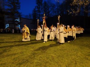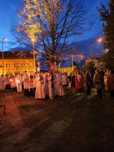 W naszej parafii świętujemy już Uroczystość Zmartwychwstania Pana na zakończenie Wigilii Paschalnej PROCESJĄ REZUREKCYJNĄ. Ze śpiewem pieśni, przy dźwiękach Orkiestry Dętej. z głosem dzwonów 3 razy idziemy wokół kościoła. W tym roku było nas tak wielu, że początek i koniec procesji prawie połączyły się w okrąg.
