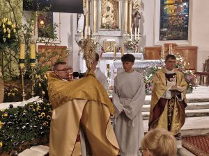 To moment, w którym tajemnica Zmartwychwstania staje się obecna tu i teraz. Na ołtarzu zostały złożone dary chleba i wina — proste, codzienne, a jednocześnie niosące w sobie obietnicę przemiany. To, co ludzkie, zostaje powierzone Bogu, aby mogło stać się tym, co Boskie. W Komunii Świętej wierni jednoczą się z Nim i między sobą. To uczta życia, która nie zna końca — zapowiedź radości wiecznej, gdzie nie będzie już nocy ani śmierci.