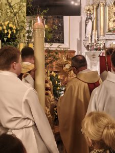 W kościele rozświetlonym płomieniem Paschału słuchaliśmy Słowa Bożego, które prowadziło nas przez historię zbawienia. Teksty ukazywały drogę od stworzenia świata, przez ofiarę Abrahama, przejście przez Morze Czerwone, aż po zapowiedzi proroków. Każde zdanie potęgowało napięcie, jakby cały wszechświat oczekiwał na tę jedyną chwilę — na tę Nową Nowinę: Chrystus zmartwychwstał! Alleluja! Świątynia rozbłysła pełnią światła, zabrzmiały organy dzwony hymnem „Chwała na wysokości Bogu.